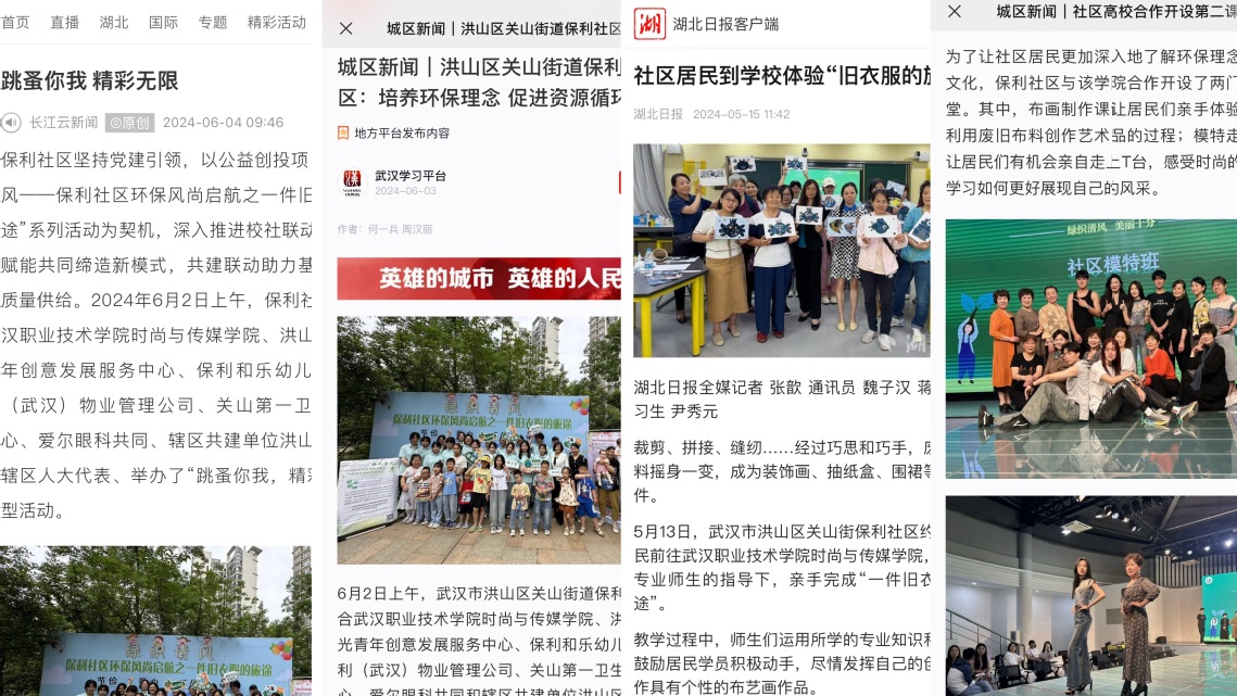 自去年2月与保利社区结对以来,时尚与传媒学院组织开展志愿服务活动50余次。今年3月至5月,时尚与传媒学院、保利社区、星光青年创意发展服务中心三方联动,成立“绿织清风”团队,依托“第二课堂”持续推进大学生社区实践计划。时尚与传媒学子们化身“小老师”,开展“沁童心”系列、“跳蚤你我,精彩无限”、“社区公益节”、“共建美好家园”等活动,开设“老年模特班”“旧衣改造班”等。