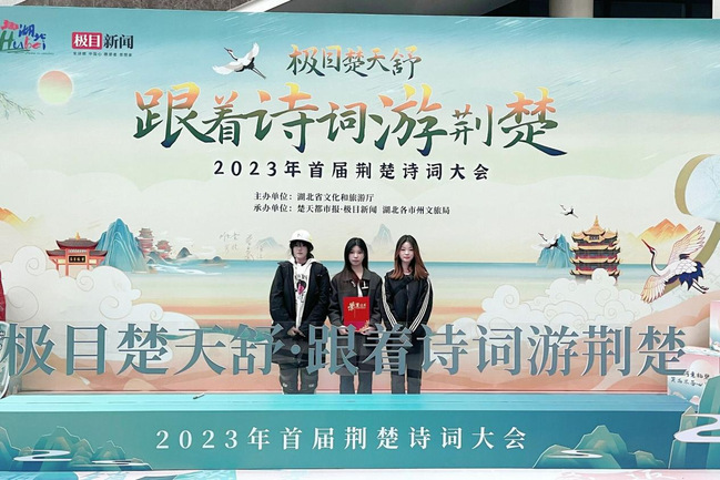武职网讯(通讯员 冯芳 大学生记者 王紫璇)11月18日,由湖北省文化和旅游厅举办的“极目楚天舒·跟着诗词游荆楚”——2023年首届荆楚诗词大会落下帷幕,文化与传媒学院学生王紫璇、谢心语、秦芷欣的作品《江城记忆》获三等奖。