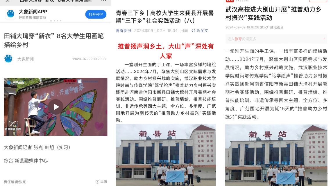 据悉,“笃学绘声”推普助力乡村振兴实践团入围教育部2024年“推普助力乡村振兴”全国大学生暑期社会实践志愿服务活动、湖北省暑期“三下乡”重点团队。未来,时尚与传媒学院将继续以社会实践活动为载体,探索实践教育的新路径,激发实践育人新活力,为培养具有社会责任感、创新精神和实践能力的高素质人才做出更大的贡献。