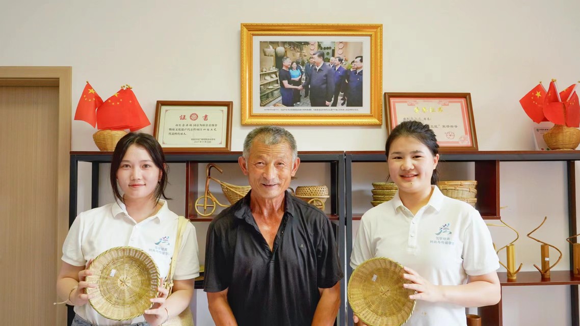 “不秋草”工艺店里,年近七旬的非遗竹编工艺传承人余品林编织竹器已有50年,能编制60多种竹编产品。余老先生年纪大,普通话沟通有困难,我们的志愿者每天都会前往其家中,进行普通话沟通交流,并教授志愿者们制作简单的竹器。