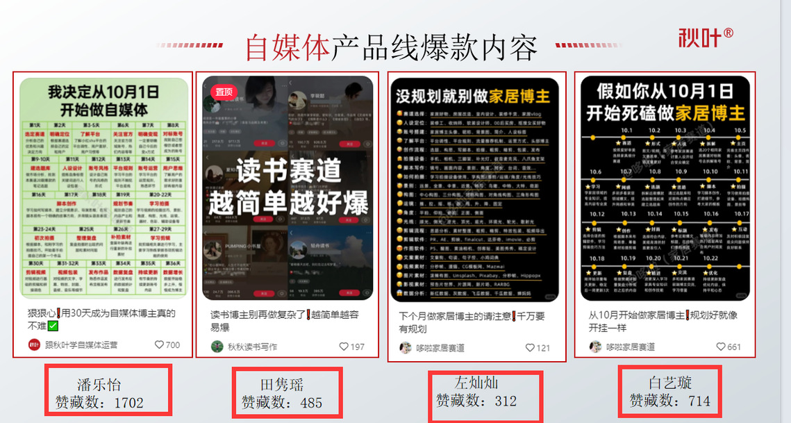 秋叶集团新媒体事业部的熊雨老师说:“在实训过程中,学生们展现出了极高的学习热情和创造力。他们不仅在四大核心实习产品线中融入创意元素,提升作品质量,更是用成千上万的赞藏数展示出武职学子们较高的专业素养。”