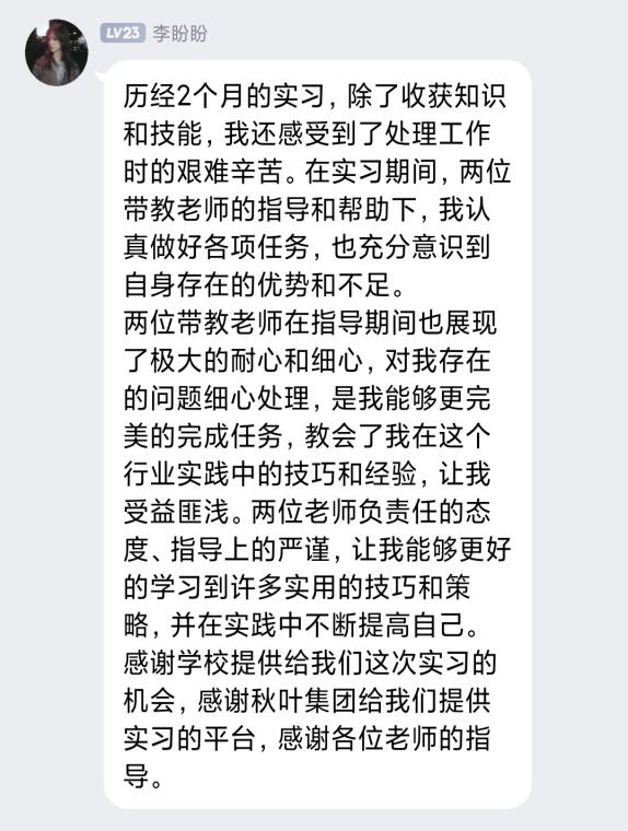 他在分享中表示:“这次实训,带教老师们教给我们很多职场中的真实技术应用方法,让我深刻体会到了职场对于新兴技术的要求,也学会了如何运用所学技能解决实际问题。感谢学院与秋叶集团提供的宝贵实习平台。”
