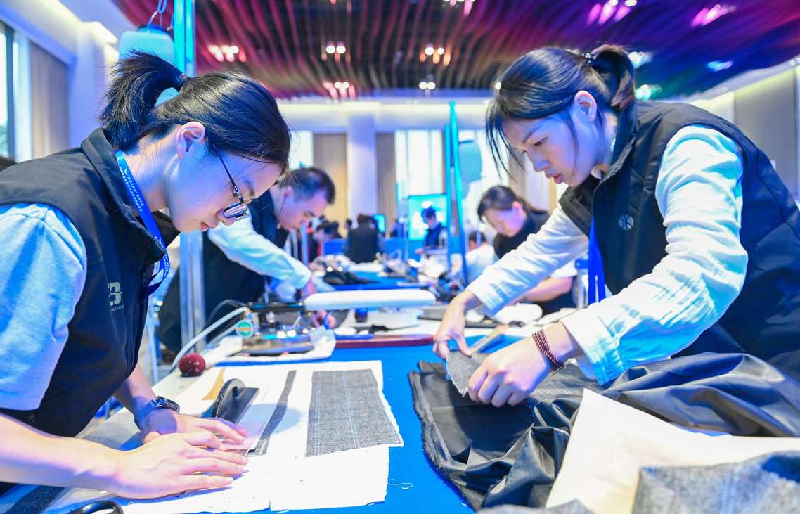 缝纫工赛项三等奖选手江锐(左一)比赛现场