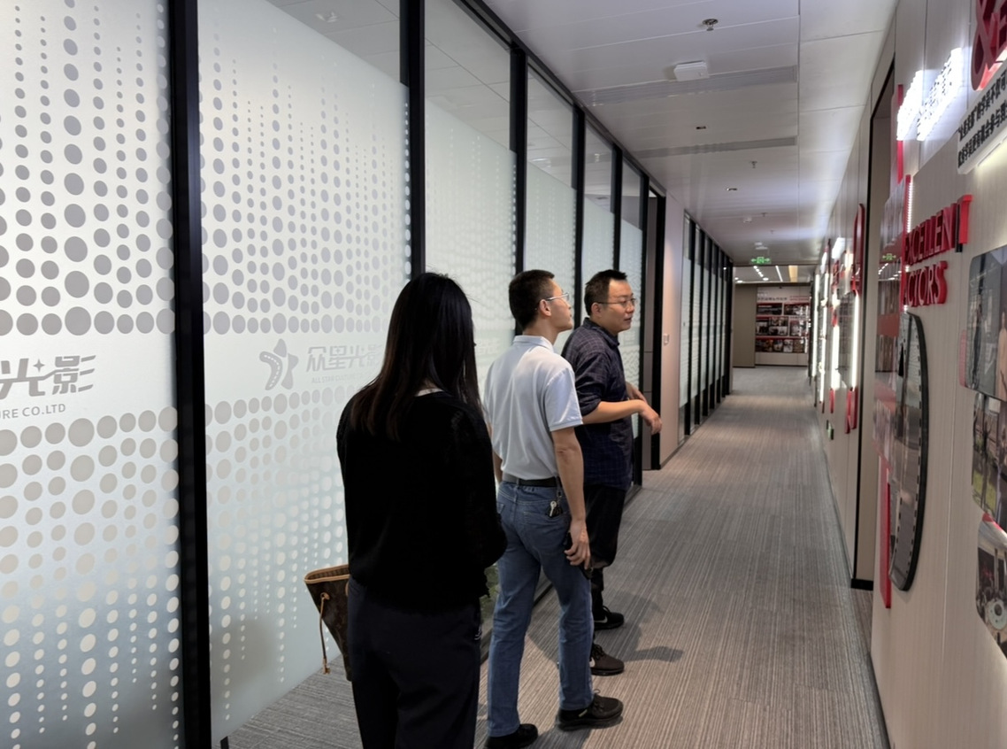 在猫眼视界办公区,教师团队深入考察了网络短剧从创作到运营的全流程生产体系。网络短剧编辑部内,编剧团队正围绕选题策划展开头脑风暴,墙面上张贴的热播剧集分镜手稿与用户反馈分析图,彰显了内容创作与市场需求的深度结合;网络短剧运营部的实时监测大屏上,跳动的流量数据与弹幕评论,展现了多平台分发策略的动态调整过程;艺人经纪部的档案墙前,签约演员的表演片段与风格标签,勾勒出精准化艺人培养路径;视频制作部的专业影棚中,多机位协同拍摄与后期剪辑工位的紧密配合,呈现了工业化内容生产的标准化流程。
