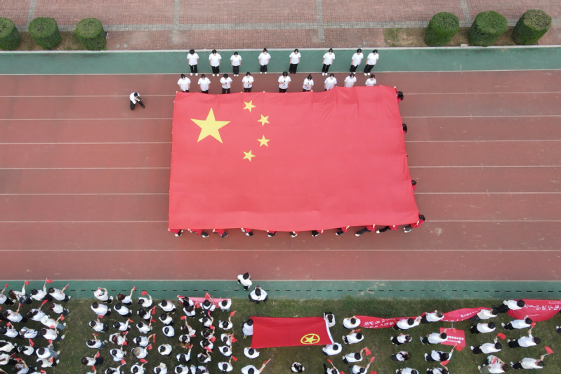 仪式尾声,青年学子代表献上朗诵与表演唱《走向复兴》,字句间满含深情,回溯祖国 76 载风雨征程,礼赞那些镌刻时代的辉煌成就。伴随着激昂的旋律,一面10米×7米的巨幅国旗缓缓掠过跑道,晨光为其镀上金边,鲜红底色在熹微中熠熠生辉。师生们挥动着手中国旗,点点鲜红与巨幅国旗交相辉映,歌声、掌声、欢呼声汇聚成礼赞祖国、矢志报国的青春交响。