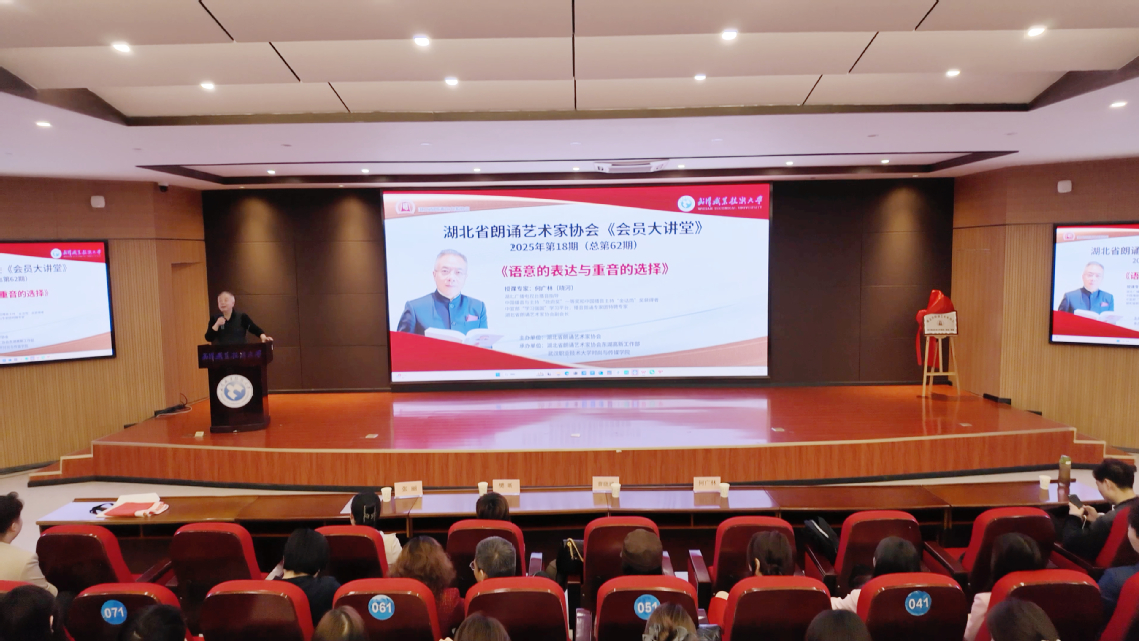 作为活动核心,中国文化大讲堂之“声动荆楚,文韵传情”专场讲座同步开讲。省朗协副会长、湖北广播电视台播音指导何广林以《语意的表达与重音的选择》为题,从“文本解读、情感共鸣、声音塑造”三个维度分享,结合《相信未来》等经典篇目现场示范,他特别强调“朗诵是用声音为文字画像,传递文化温度”。在互动环节,他对学生朗诵作品点评,针对“方言口音矫正”“即兴表达技巧”等问题提供指导。2024级播音专业学生孙亦凡说:“讲座让我明白语言艺术不仅是专业技能,更是文化传承的载体,未来会积极参与基地实践提升能力。”