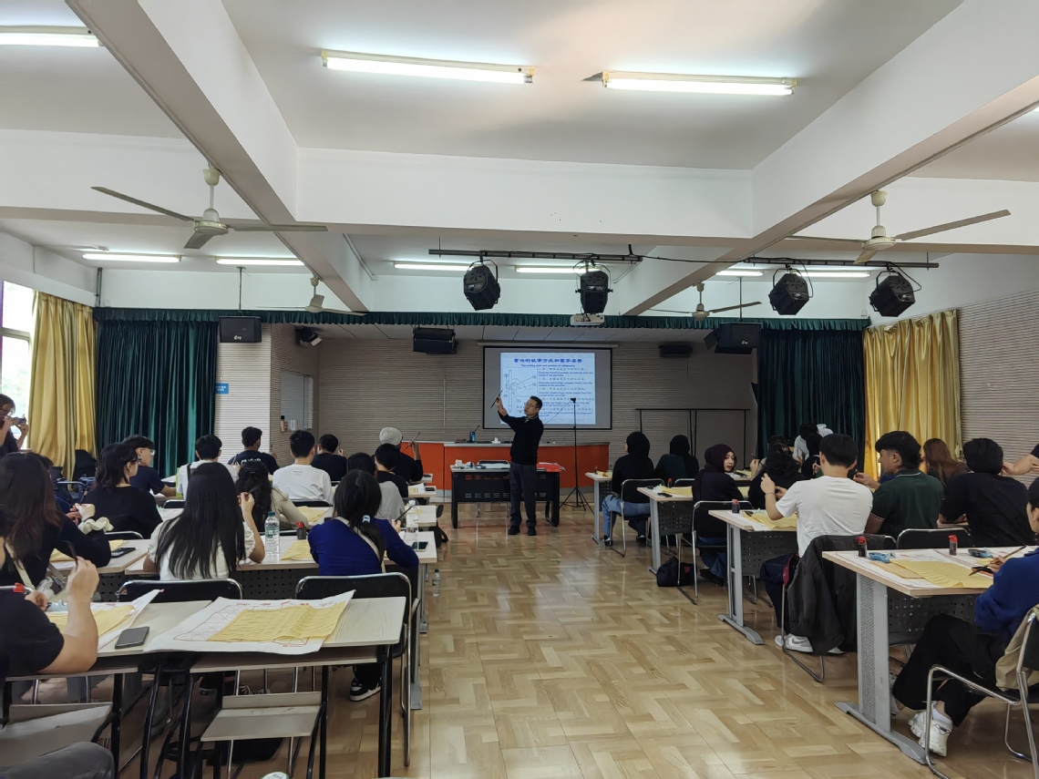 在书法体验环节,时尚与传媒学院党委书记曹晓斌讲解中国书法历史脉络与艺术特色,他从甲骨文、金文到楷书、行书演变入手,现场演示执笔、运笔等技法。从“永字八法”的精微笔势,阐释“字如其人”的生命哲学,称“书法是笔尖下的舞蹈,是纸张上的修行”。
