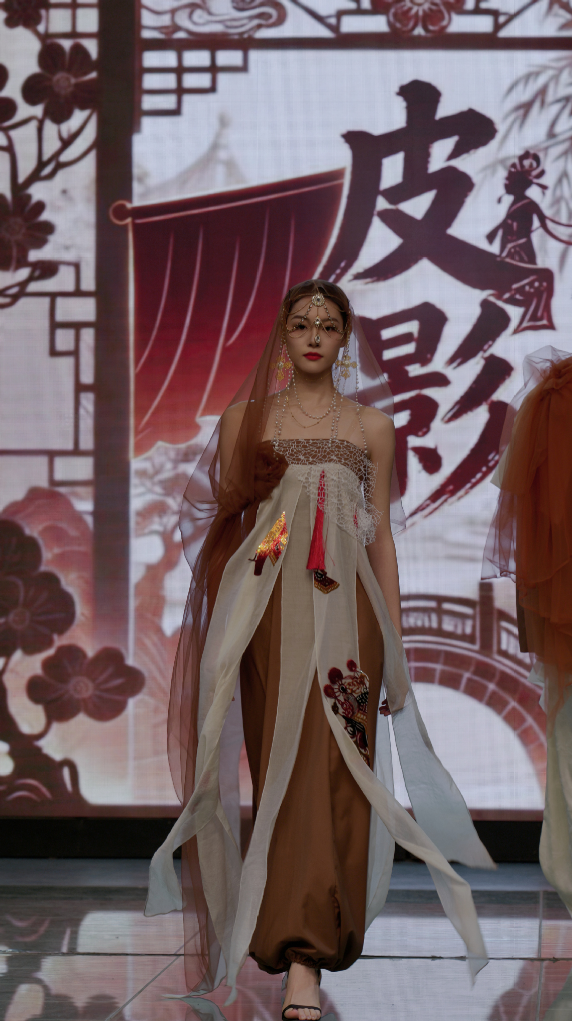 动态秀集中呈现了《解构查尔瓦》《浪舞潮汐,听海》《墨韵革华,袂映新章》《皮影》《金叙》等十余组毕业设计系列。从非遗传承、可持续时尚、国潮创新、数字融合、海洋保护等多个维度展开创作实践。《解构查尔瓦》以当代设计语言重构民族传统披毡;《浊洋》将海洋废弃物料转化为服饰元素,传达生态保护理念;《银绣新序》推动苗绣工艺融入现代生活语境;《织暗时刻》则借哥特美学演绎暗黑设计哲学......这些作品不仅体现出学生们在文化传承、科技应用与设计表达上的深入探索,也生动诠释了传统与未来、技艺与观念在时装创作中的融合共生。