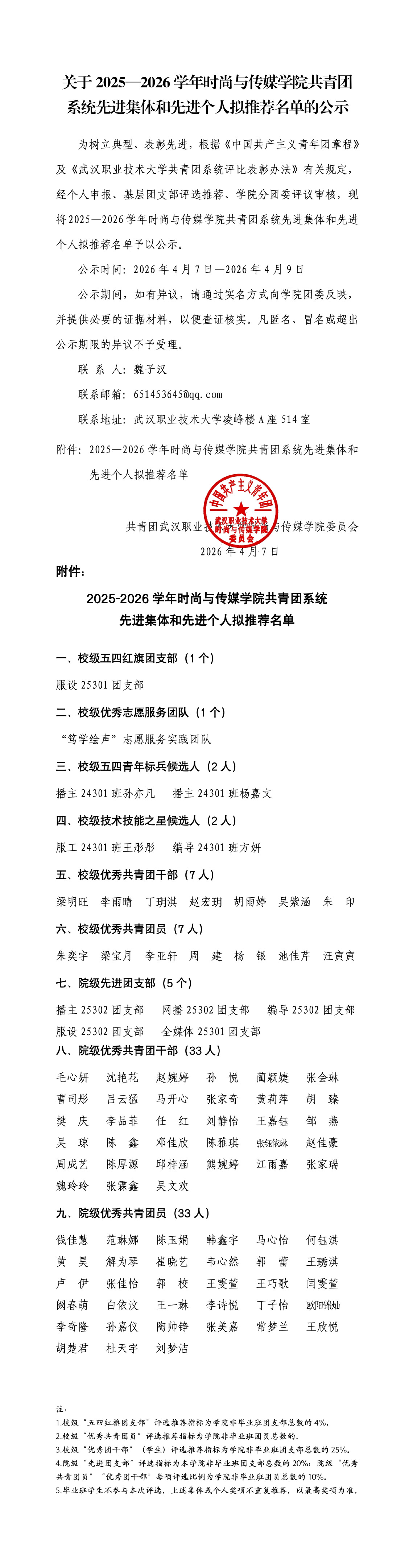关于2025—2026学年时尚与传媒学院共青团系统先进集体和先进个人拟推荐名单的公示